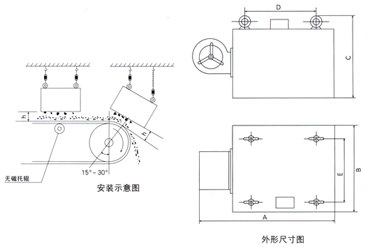 RCDC系列风冷自缷式电磁除铁器,是在RCDA系列风冷悬挂式电磁除铁器的基础上增加了驱动电机、滚筒、带刮板的缷铁胶带等组成的缷铁机构。在工作过程中缷铁机构自动将缷铁皮带上吸附的铁磁性物质抛到除铁器以外的集铁箱内,无需停电人工清理,实现了除铁自动化。 在钢铁厂、水泥厂多用于矿渣除铁和保护辊压机、立磨、破碎机等重要设备。