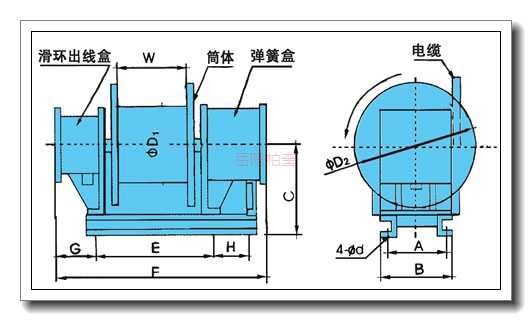 结构特点:1、采用蜗卷弹簧为动力,不消耗电能,工作可靠;2、采用集电环-碳刷架结构传递电能,工作可靠;3、设置了可反转机构,避免卷筒反转而折断弹簧。